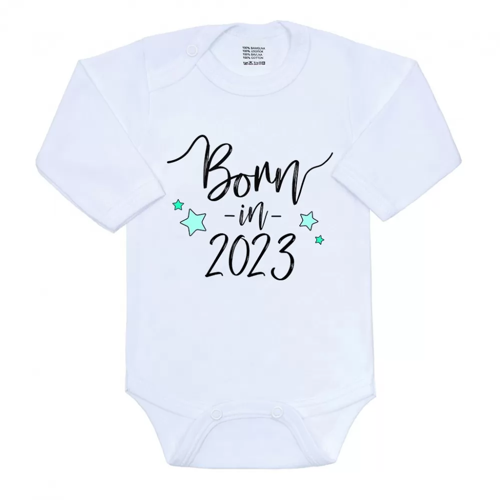 Originální bavlněné kojenecké body s dlouhým rukávem New Baby s nápisem Born in 2023. Barvy použité k potisku jsou certifikované a vhodné pro miminka… Celý popis