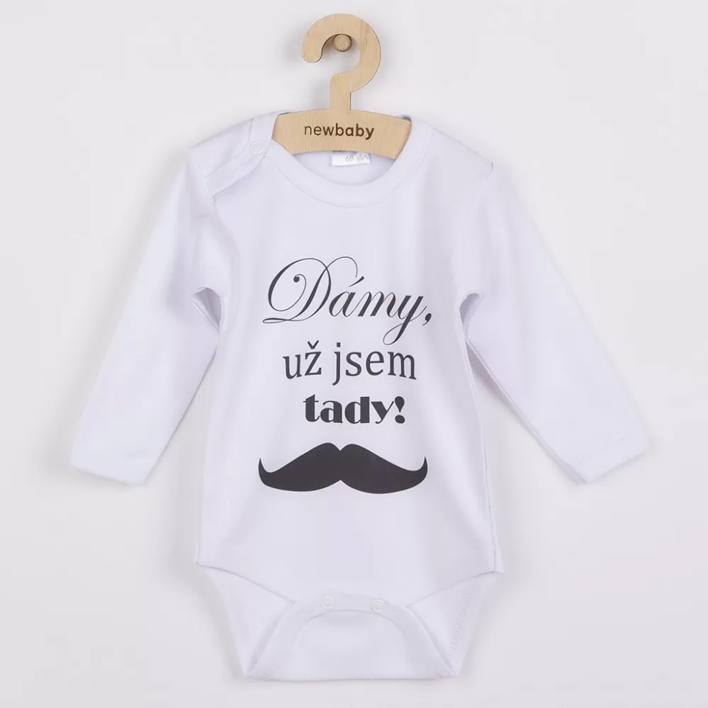 Originální bavlněné kojenecké body s dlouhým rukávem New Baby, s vtipným nápisem Dámy, už jsem tady! Barvy použité k potisku jsou certifikované a vhodné pro miminka. Je vyrobeno z příjemného a kvalitního materiálu, ve kterém se bude Vaše miminko cítit příjemně. Body má zapínáni na cvočky na ramínku a mezi nožičkami, což usnadňuje oblékání a přebalování. Dopřejte Vašemu miminku vyniknout v originálním body. Složení: 100% bavlna. Rozměry: obvod kolem hrudníku cca 40 cm, délka rukávu cca 22 cm, celková délka cca 36 cm.
