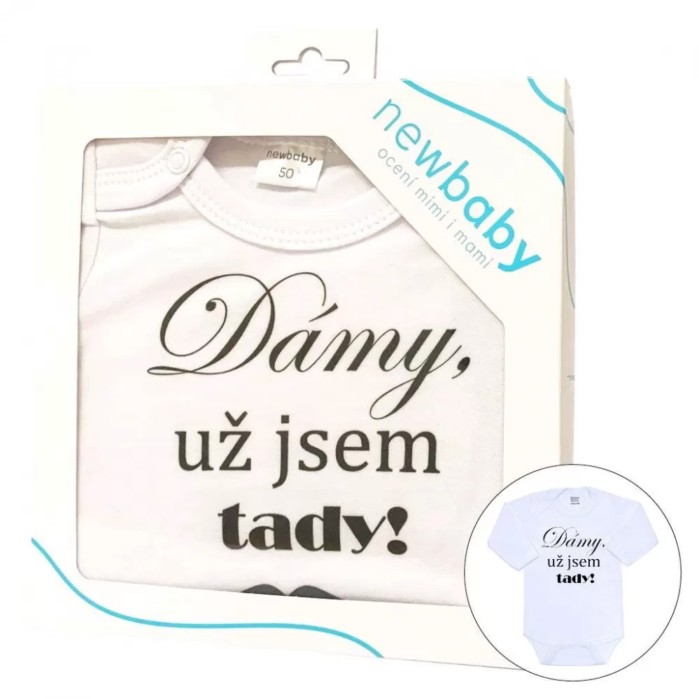 Originální bavlněné kojenecké body s dlouhým rukávem New Baby, s vtipným nápisem Dámy, už jsem tady! Barvy použité k potisku jsou certifikované a vhodné pro miminka. Je vyrobeno z příjemného a kvalitního materiálu, ve kterém se bude Vaše miminko cítit příjemně. Body má zapínáni na cvočky na ramínku a mezi nožičkami, což usnadňuje oblékání a přebalování. Dopřejte Vašemu miminku vyniknout v originálním body. Složení: 100% bavlna. Rozměry: obvod kolem hrudníku cca 46 cm, délka rukávu cca 24 cm, celková délka cca 40 cm.