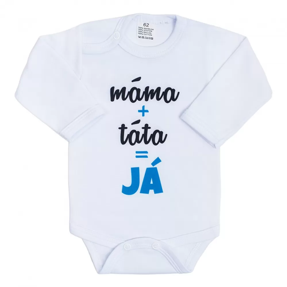 Originální bavlněné kojenecké body s dlouhým rukávem New Baby, s vtipným nápisem máma+táta=JÁ. Barvy použité k potisku jsou certifikované a vhodné pro miminka. Je vyrobeno z příjemného a kvalitního materiálu, ve kterém se bude Vaše miminko cítit příjemně. Body má zapínáni na cvočky na ramínku a mezi nožičkami, což usnadňuje oblékání a přebalování. Dopřejte Vašemu miminku vyniknout v originálním body. Složení: 100% bavlna. Rozměry: obvod kolem hrudníku cca 50 cm, délka rukávu cca 26 cm, celková délka cca 42 cm.