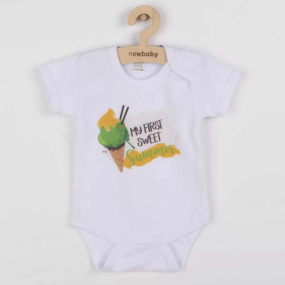 Originální bavlněné kojenecké body s krátkým rukávem New Baby s nápisem MY FIRST SWEET Summer a obrázkem chutné zmrzlinky. Barvy použité k potisku… Celý popis