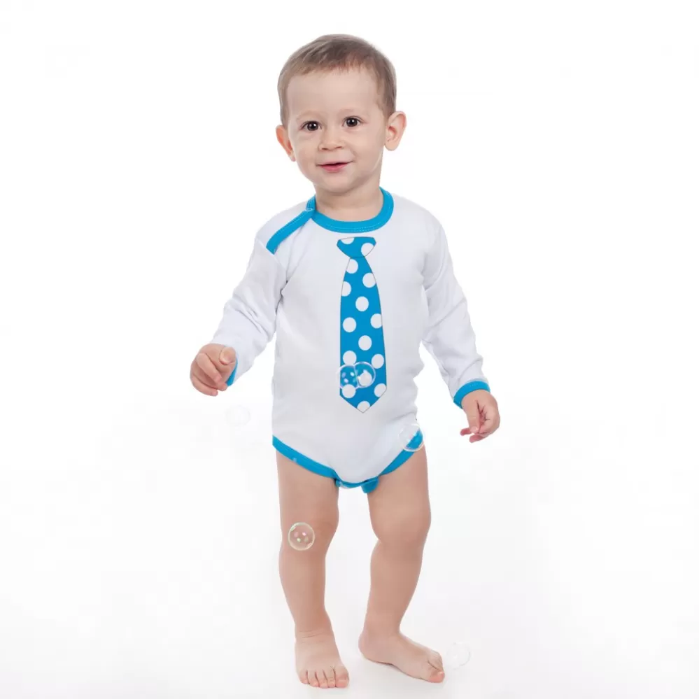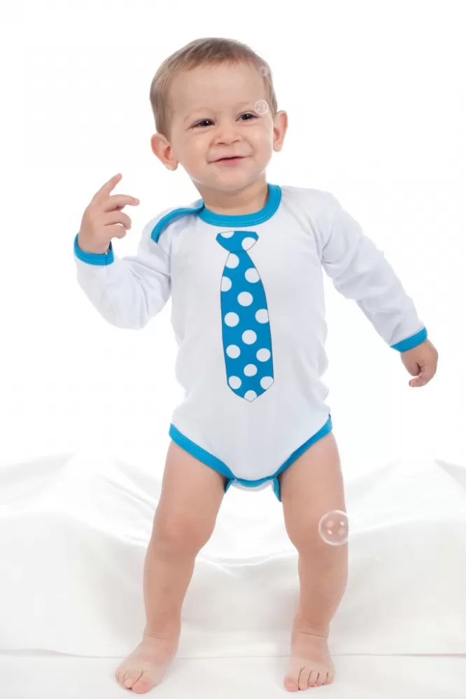 Originální bavlněné kojenecké body s dlouhým rukávem New Baby, s obrázkem tyrkysové kravaty zdobené puntíky. Body má kolem krčku, nožiček a ručiček… Celý popis