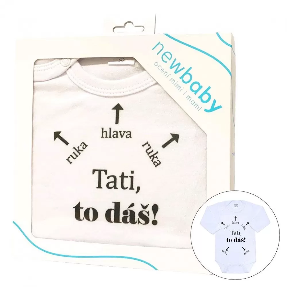 Originální bavlněné kojenecké body s dlouhým rukávem New Baby, s vtipným nápisem Tati, to dáš! Barvy použité k potisku jsou certifikované a vhodné pro miminka. Je vyrobeno z příjemného a kvalitního materiálu, ve kterém se bude Vaše miminko cítit příjemně. Body má zapínáni na cvočky na ramínku a mezi nožičkami, což usnadňuje oblékání a přebalování. Dopřejte Vašemu miminku vyniknout v originálním body. Složení: 100% bavlna. Rozměry: obvod kolem hrudníku cca 50 cm, délka rukávu cca 26 cm, celková délka cca 42 cm.