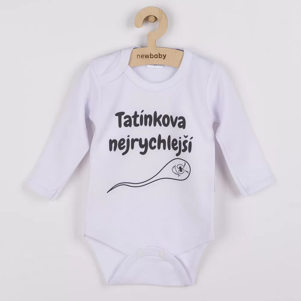 Originální bavlněné kojenecké body s dlouhým rukávem New Baby, s vtipným nápisem TATÍNKOVA NEJRYCHLEJŠÍ. Barvy použité k potisku jsou certifikované a vhodné pro miminka. Je vyrobeno z příjemného a kvalitního materiálu, ve kterém se bude Vaše miminko cítit příjemně. Body má zapínáni na cvočky na ramínku a mezi nožičkami, což usnadňuje oblékání a přebalování. Dopřejte Vašemu miminku vyniknout v originálním body. Složení: 100% bavlna. Rozměry: obvod kolem hrudníku cca 40 cm, délka rukávu cca 22 cm, celková délka cca 36 cm.