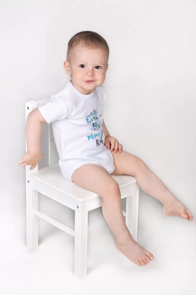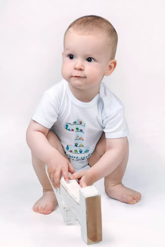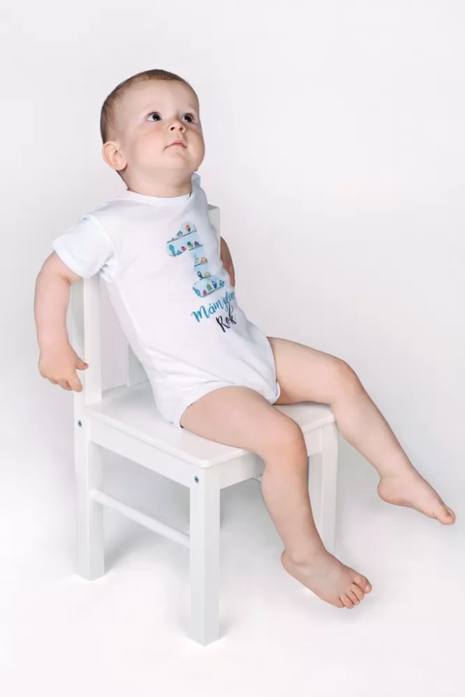Originální bavlněné kojenecké body s dlouhým rukávem New Baby, s vtipným nápisem Už mám 1 rok a obrázkem velké jedničky s balónky. Barvy použité k… Celý popis