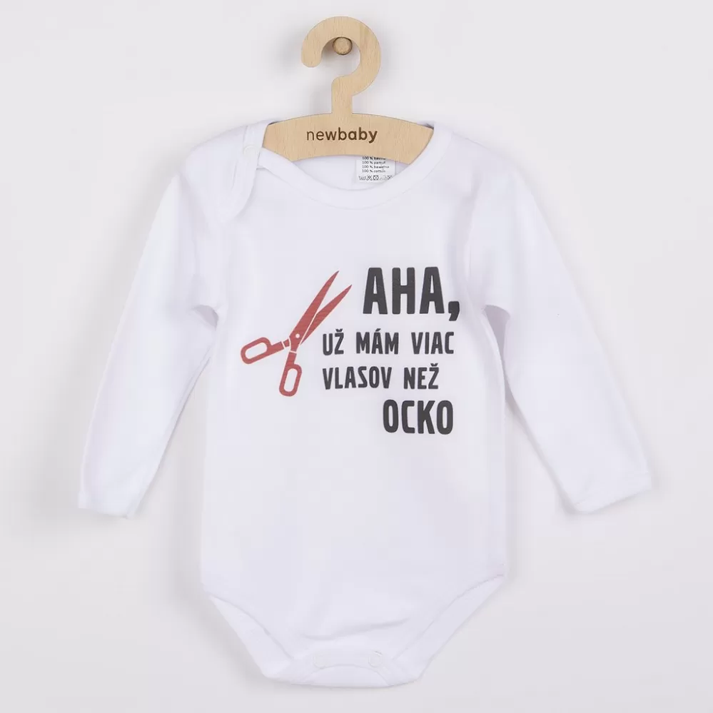 Originální bavlněné kojenecké body s dlouhým rukávem New Baby, s vtipným nápisem AHA UŽ MÁM VIAC VLASOV NEŽ OCKO. Barvy použité k potisku jsou… Celý popis