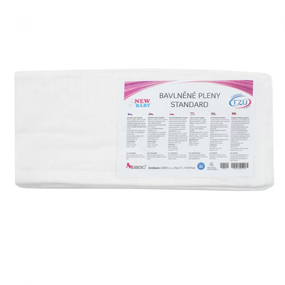 Bavlněné dětské pleny standardní kvality. Balení 10 ks. Rozměr 70x80 cm, 100% bavlna, gramáž: 115 g/m2. Pleny mají 2 okraje pevné a 2 zašité. Výrobek ověřen Textilním zkušebním ústavem, s.p., Brno. Nelze sušit v sušičce.
