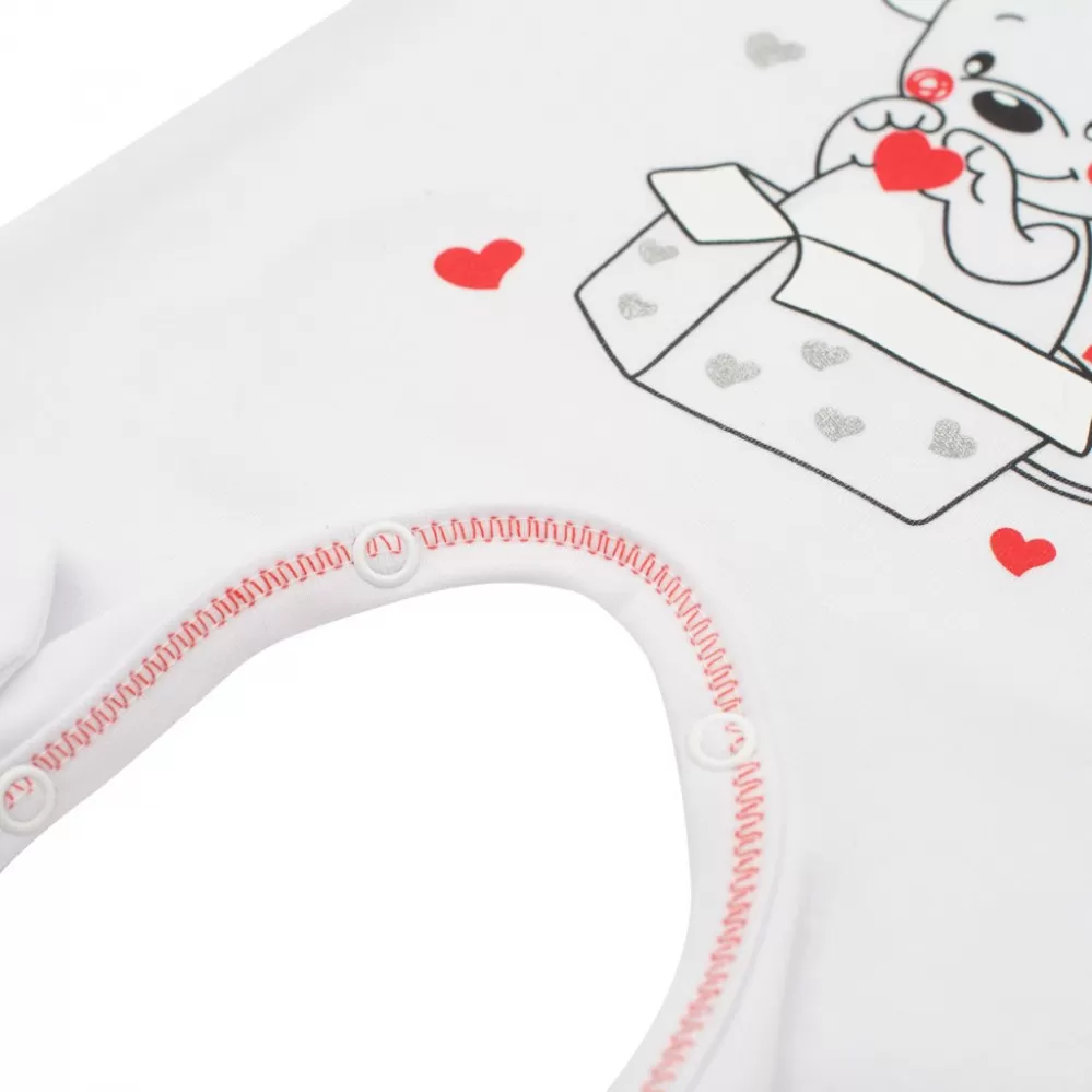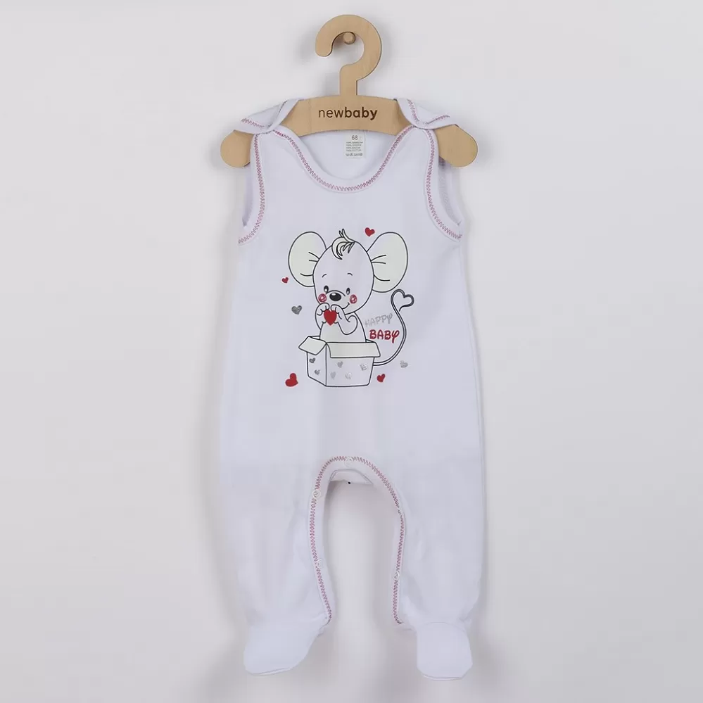 Kojenecké dupačky New Baby Mouse. Dupačky jsou zdobené barevným lemováním a velkým obrázkem myšky. Zapínání na cvočky na ramínku a mezi nožičkami. Mají velice příjemný a kvalitní materiál. Složení: 100% bavlna. Produkt české značky.