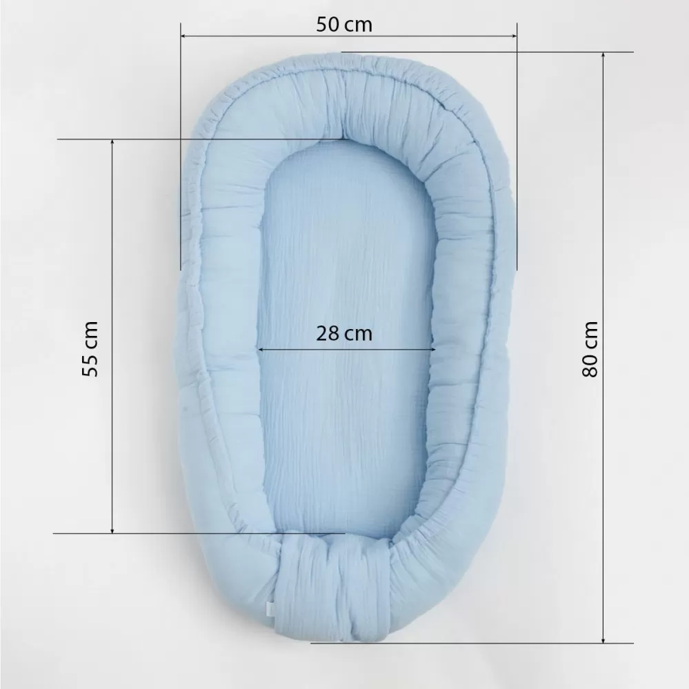 Mušelínové hnízdečko New Baby je vyrobeno uz prvotřídní bavlněné příze. Umožňuje umístit dítě do pohodlné polohy a hlavně může být dítě umístěné v kokonu stále v blízkosti maminky. Při cestování si můžete vzít hnízdečko s sebou, aby dítě připoutané k vůni domova a svému místu mohlo bezstarostně spát na jiném místě. Hnízdečko můžete umístit do postýlky, na pohovku, na zemi i do kočárku. Dítě v něm může spát, odpočívat nebo si hrát. Hnízdečko bude velkým pomocníkem ve vaší domácnosti. Určeno pro miminka od 0- 12 měsíců.