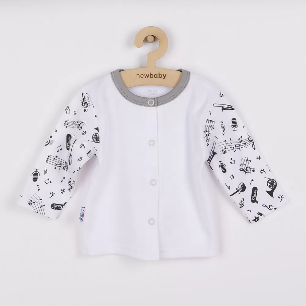 Bavlněný kojenecký kabátek New Baby Music pro miminka. Kabátek je jednobarevný a rukávky jsou celopotištěné notičkami a hudebními nástroji. Zapínání na cvočky po celé délce. Náš hravý kabátek je vhodný pro kluky i holčičky. Složení: 100% bavlna. Rozměry: obvod kolem hrudníku cca 46 cm, délka rukávu cca 22 cm, celková délka cca 29 cm.