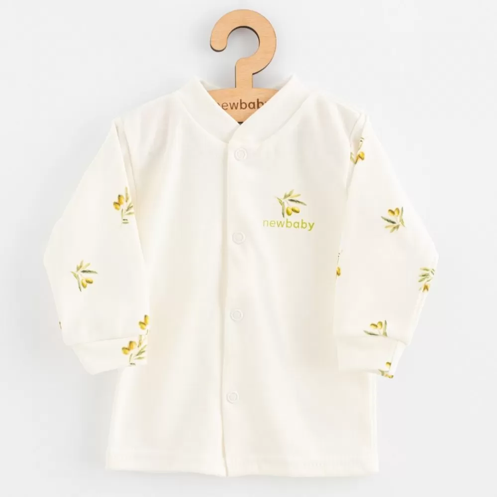 Krásný bavlněný kojenecký kabátek české značky New Baby Olivy. Kabátek zdobí potisk s olivkami. Zapínání na cvočky po celé délce usnadňují oblékání a přebalování.