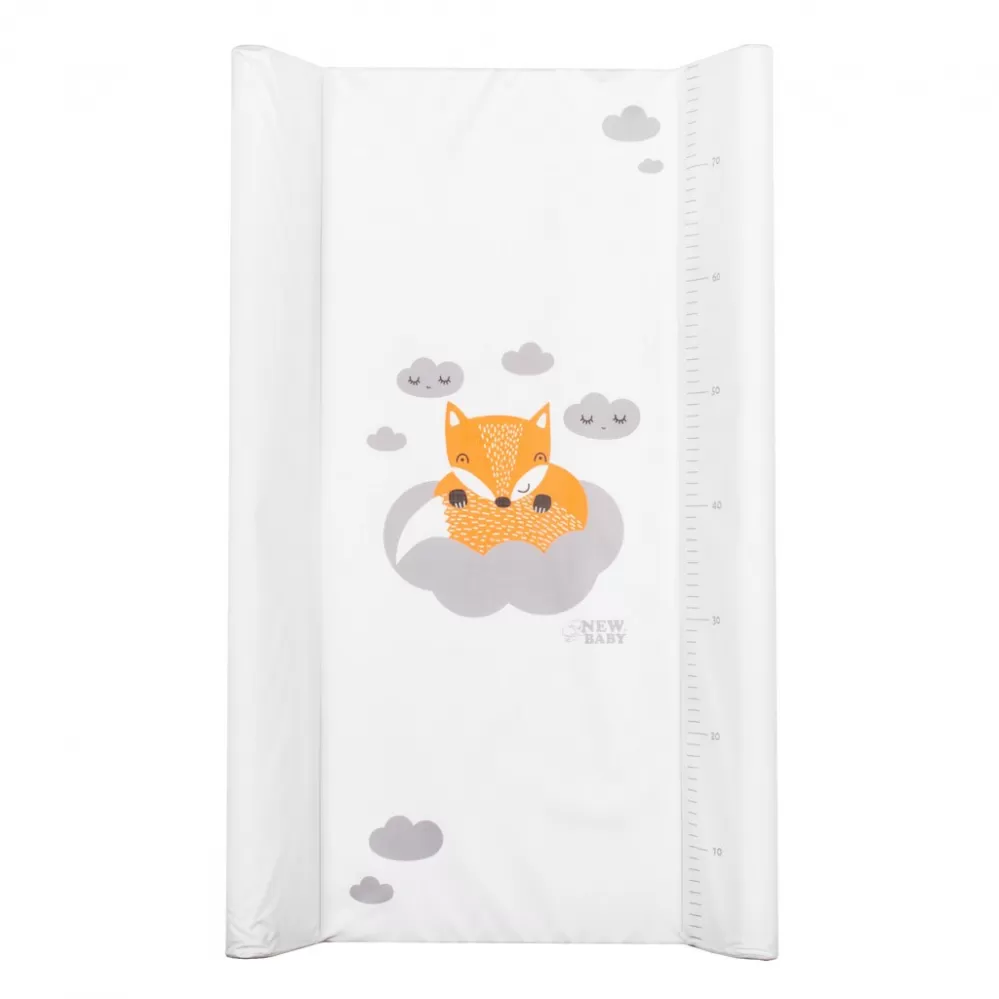 Praktická tvarovaná přebalovací podložka New Baby z nepromokavého, plastového materiálu s obrázkem lišky a obláčků. Produkt české značky. Podložka má vyvýšené boční strany a lze jí použít na komodě či jiném místě k přebalování. Bez tvrdého podkladu. Rozměr: cca 80x50 cm, tloušťka cca 2 cm, výška hran 8 cm.