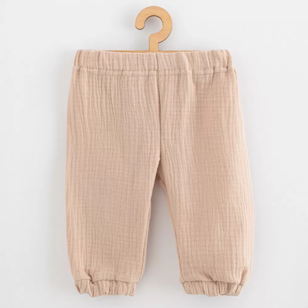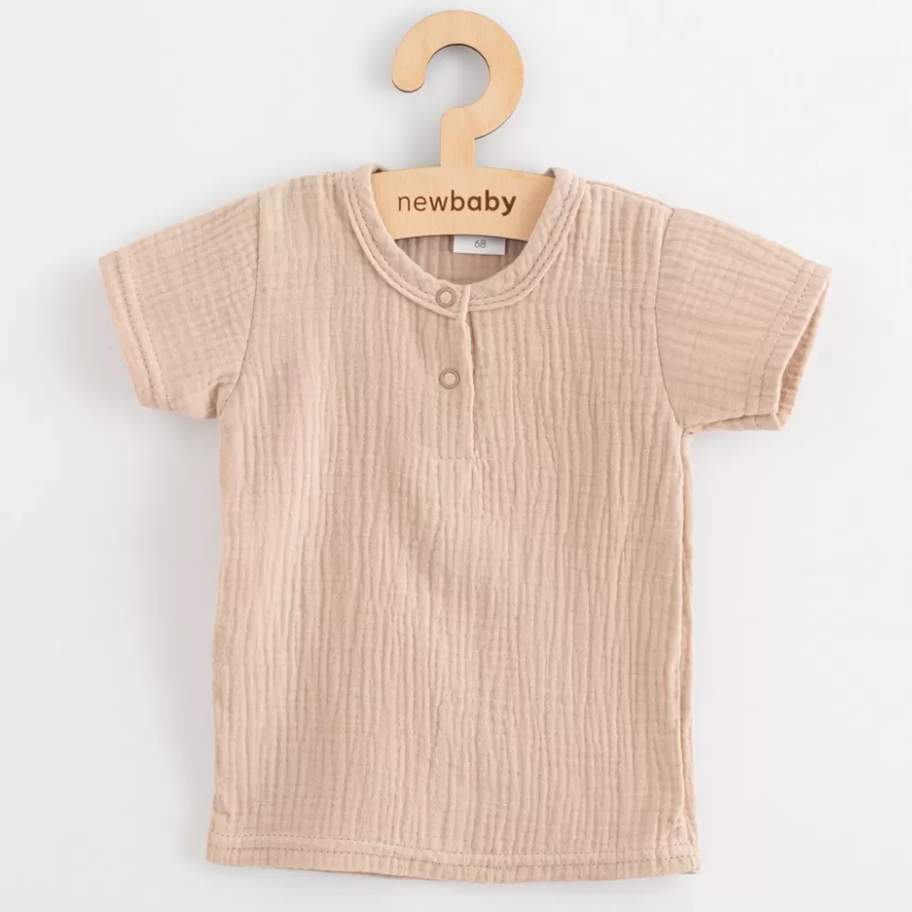 Stylová a praktická 2-dílná dětská souprava české značky New Baby. Mušelínová soupravička se skládá z trička s krátkým rukávem a kalhot. Velmi praktický set pro děti v jarních i letních dnech. Mušelínové tričko je velmi pohodlné už jen tím, že je vyrobeno z kvalitní a prodyšné mušelínové bavlny se zapínáním na cvočky pod krčkem. Mušelínové kalhoty s moderním střihem jsou velmi praktické, v pase a na nohavičkách je gumička, která netlačí.
